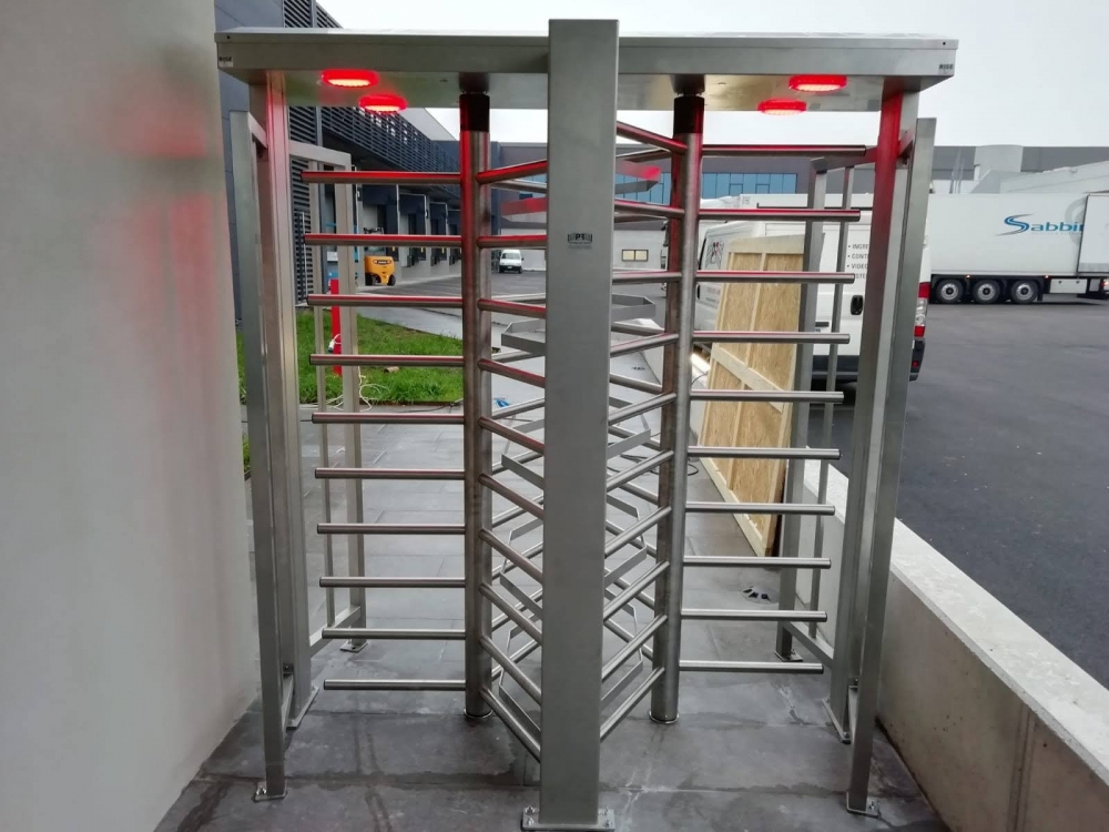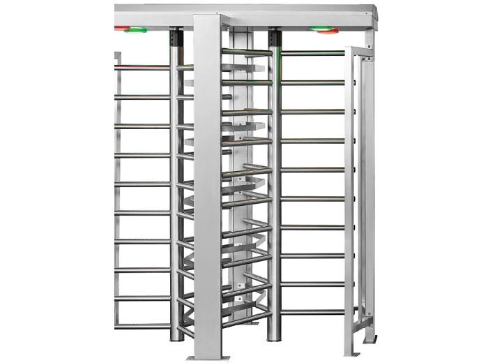Turnichet bidirecțional electromecanic din oțel galvanizat (RAL 9006) de tip full-height cu două pasaje, rotor cu 3 segmente, unitate control inclusă