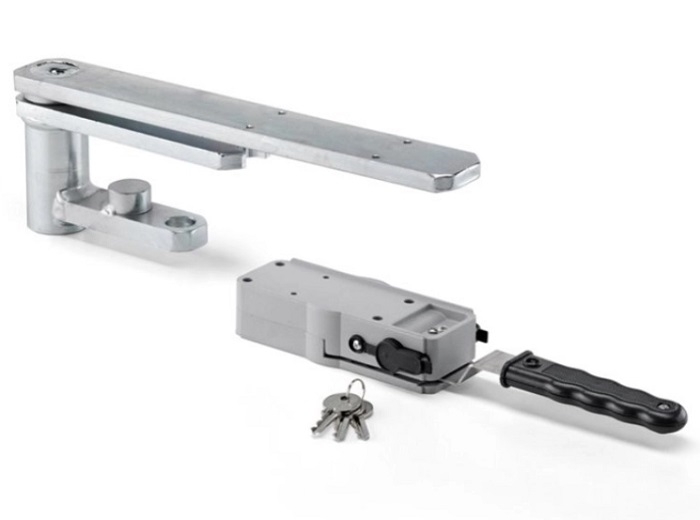 Kit cu cheie de deblocare personalizata si componente pentru conectarea motorului cu poarta, include opritoarea mecanica