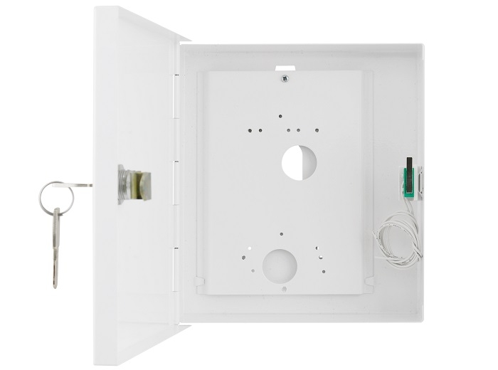 Carcasa metalica pentru tastaturi LED/B SIN, dimensiuni externe W=169, H=190, D=50 (+/-2mm), dimensiuni montare tastaturi W=110, H=185, D=41 (+/-2mm), utilizare in interior, carcasa alba din otel de grosime 0.7mm, se poate incuia, protectie tamper la deschiderea carcasei.