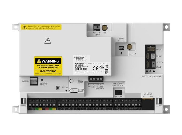 Placa centrala AX HYBRID PRO G2 cu 64 zone (8 zone pe placa) si 64 iesiri, 32 partitii, 2 iesiri PGM pe placa, 2 iesiri releu pe placa, posibilitate conectare 24 camere-PIR, posibilitate programare 256 scenarii automatizare, 2 porturi Bus, tehnologie Bus - half-duplex RS-485, interfete comunicare - LAN/Ethernet, Wi-Fi (2.4GHz), GPRS, 4G/LTE, PSTN, alimentare principala 100-240VAC 50/60Hz, 0.3A, alimentare auxiliara cu 1 acumulator SLA neinclus de 12VDC 7Ah